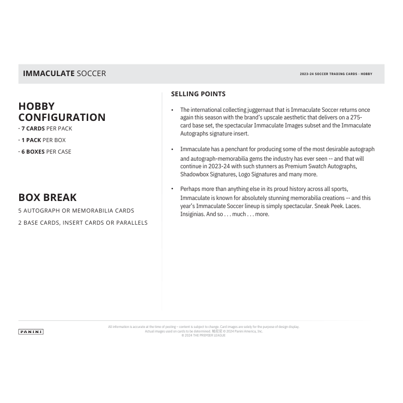 - The international collecting juggernaut that is Immaculate Soccer returns once again this season with the brand’s upscale aesthetic that delivers on a 275-card base set, the spectacular Immaculate Images subset and the Immaculate Autographs signature insert.