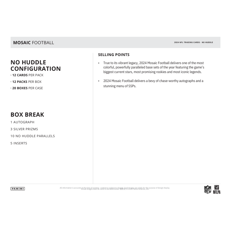 - True to its vibrant legacy, 2024 Mosaic Football delivers one of the most colorful, powerfully paralleled base sets of the year, featuring the game’s biggest current stars, most promising rookies and most iconic legends.